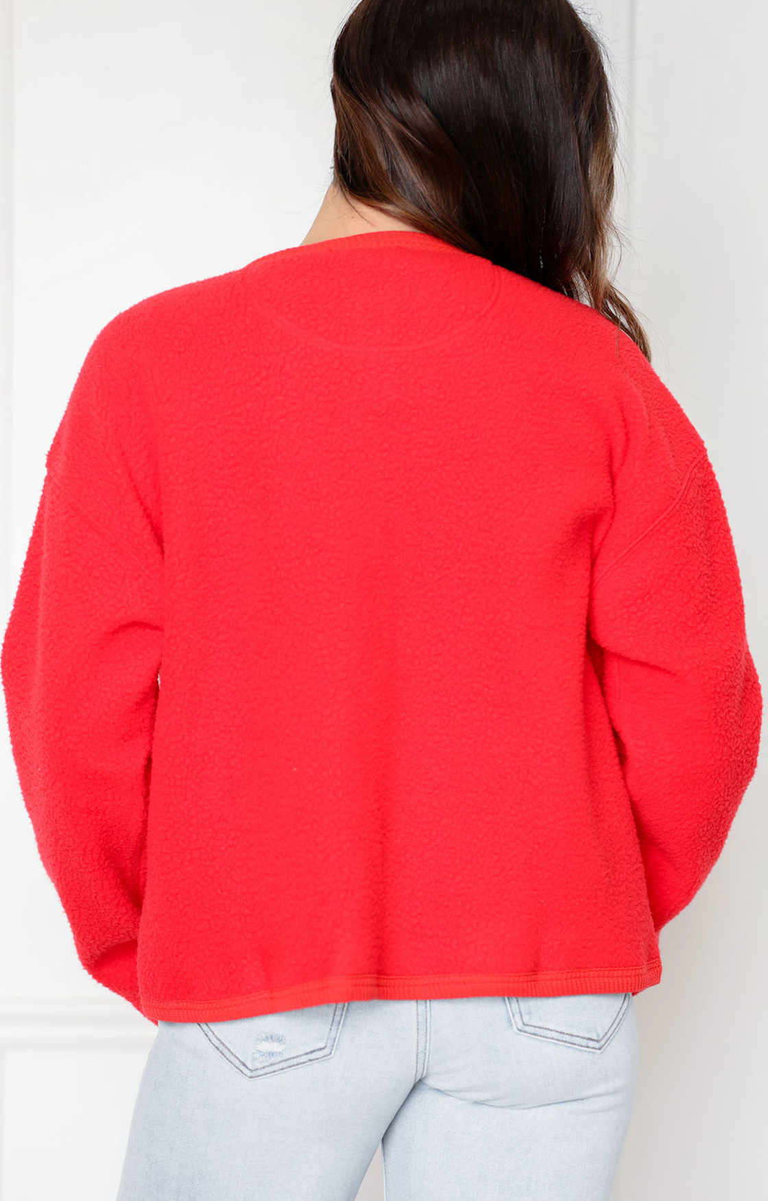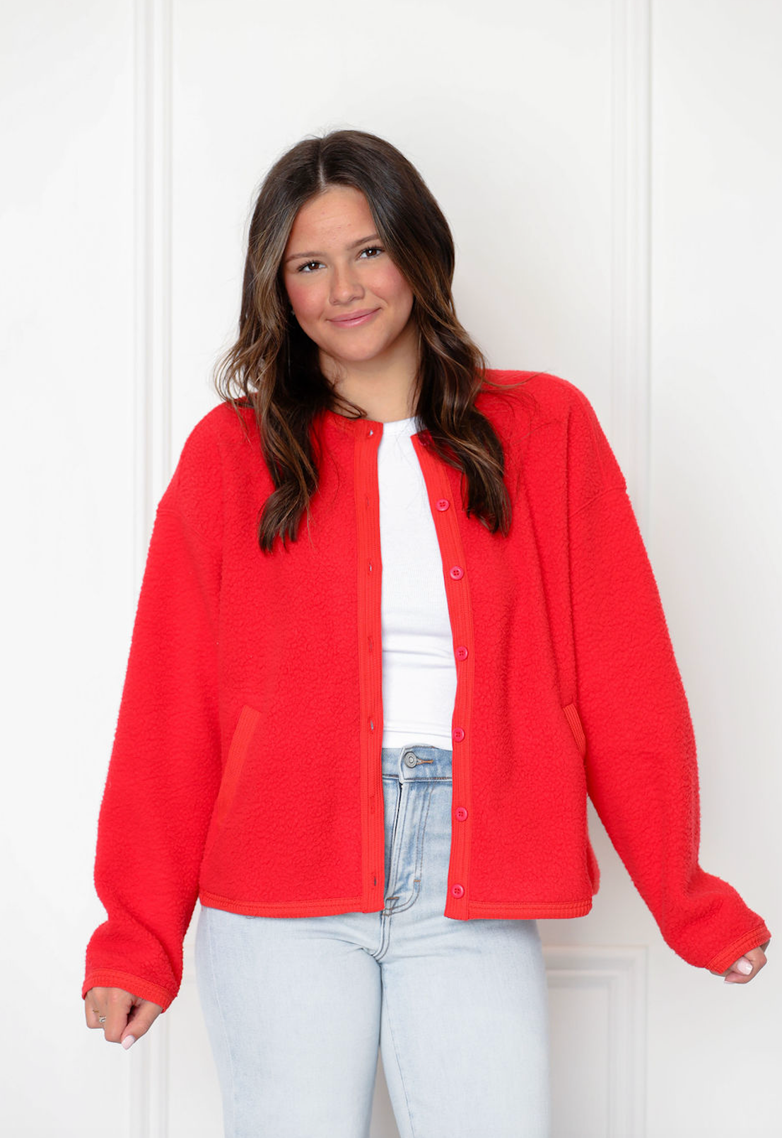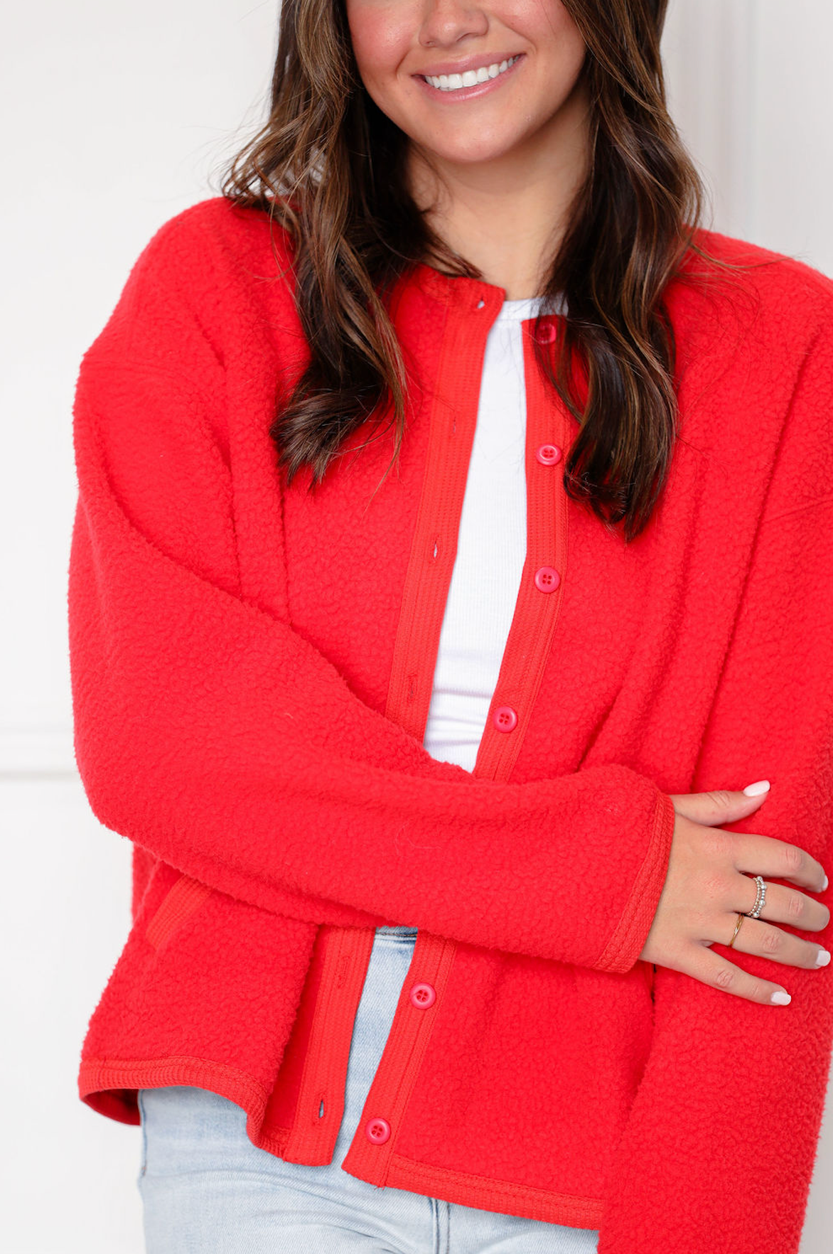 Wrap yourself in warmth and style with our Red Sherpa Button Up Jacket. Designed for effortless layering, this cropped silhouette brings a bold pop of color and plush comfort to your everyday wardrobe.