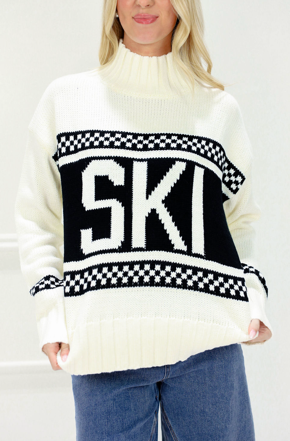 Hit the slopes in style with this SKI Town turtleneck sweater. White base with bold black color blocking and patterns creates eye-catching contrast, while the "SKI" lettering adds playful attitude. Perfect for apres-ski vibes or anyone who loves that cozy mountain aesthetic year-round.