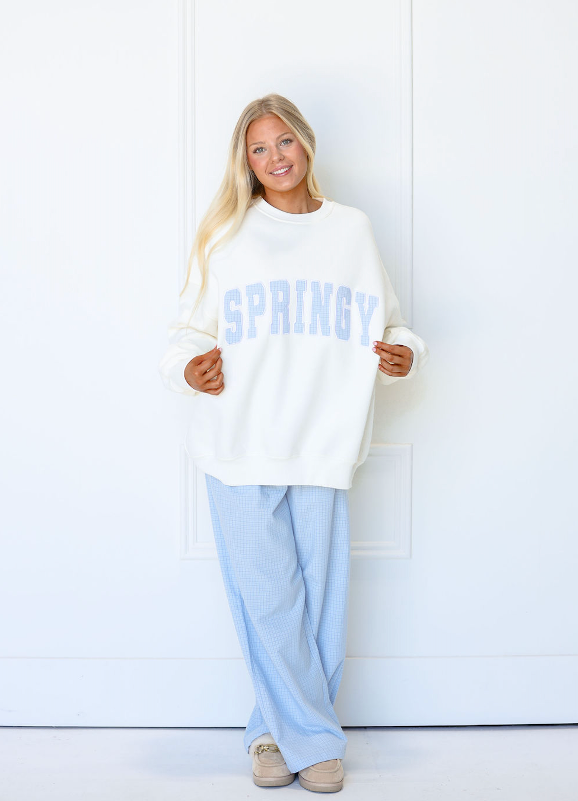 Brighten your days in this cheerful yellow crewneck sweatshirt featuring playful blue and white gingham "SPRINGY" lettering. Perfect for embracing the season's fresh energy, it's soft, comfortable, and brings instant positivity to any casual outfit.