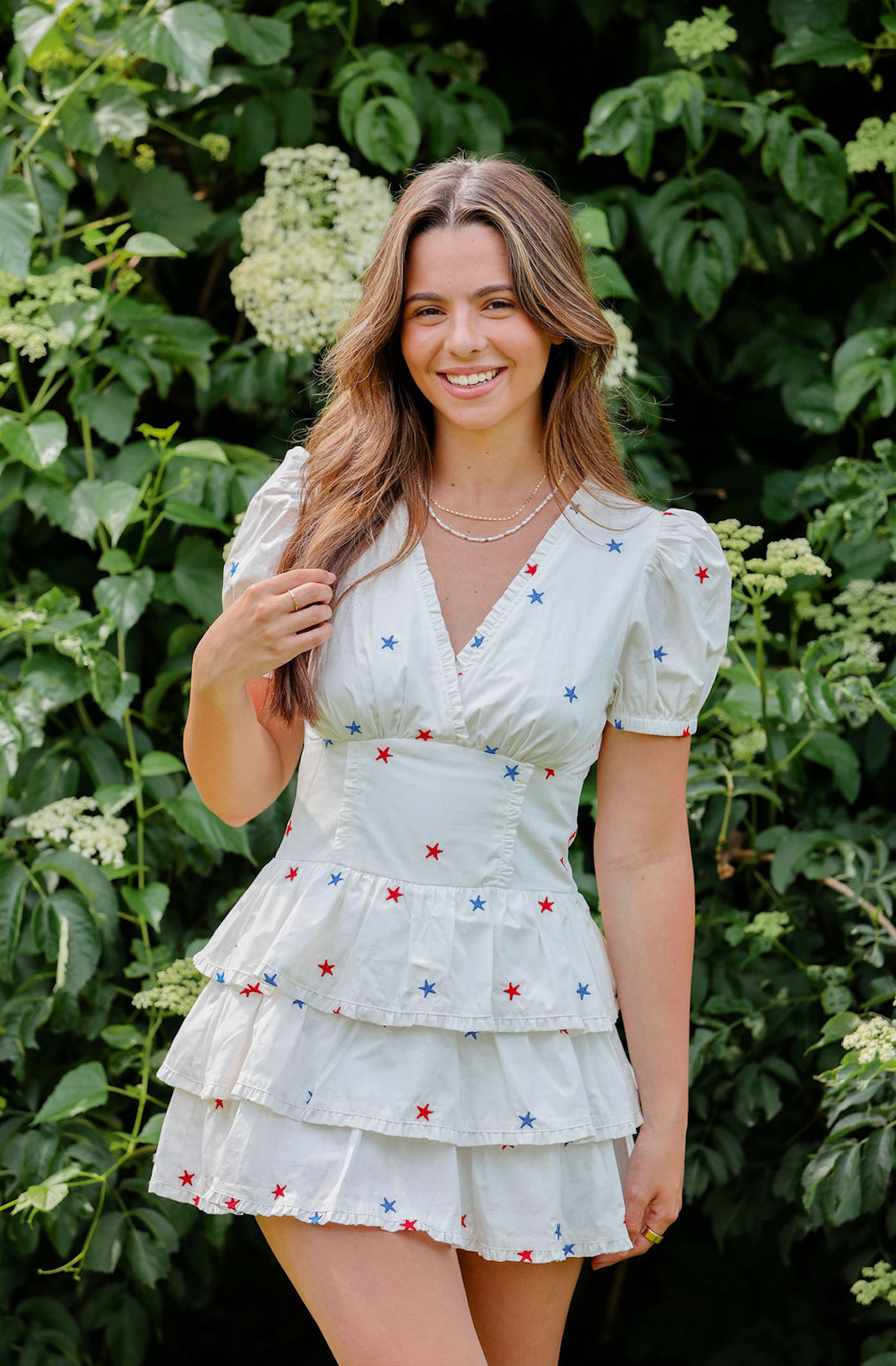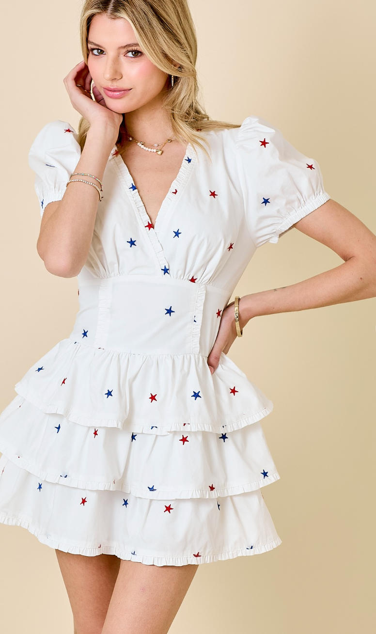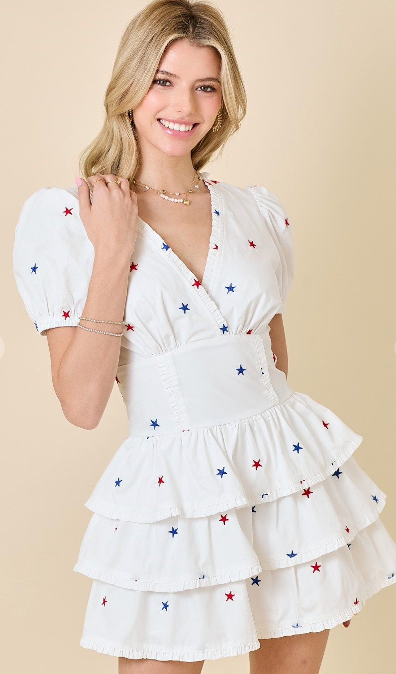 The Star Embroidered Ruffle Romper Dress is the ultimate party pick! With puff sleeves, layered ruffles, and red, white, and blue star details, it’s playful, patriotic, and perfect for summer fun.