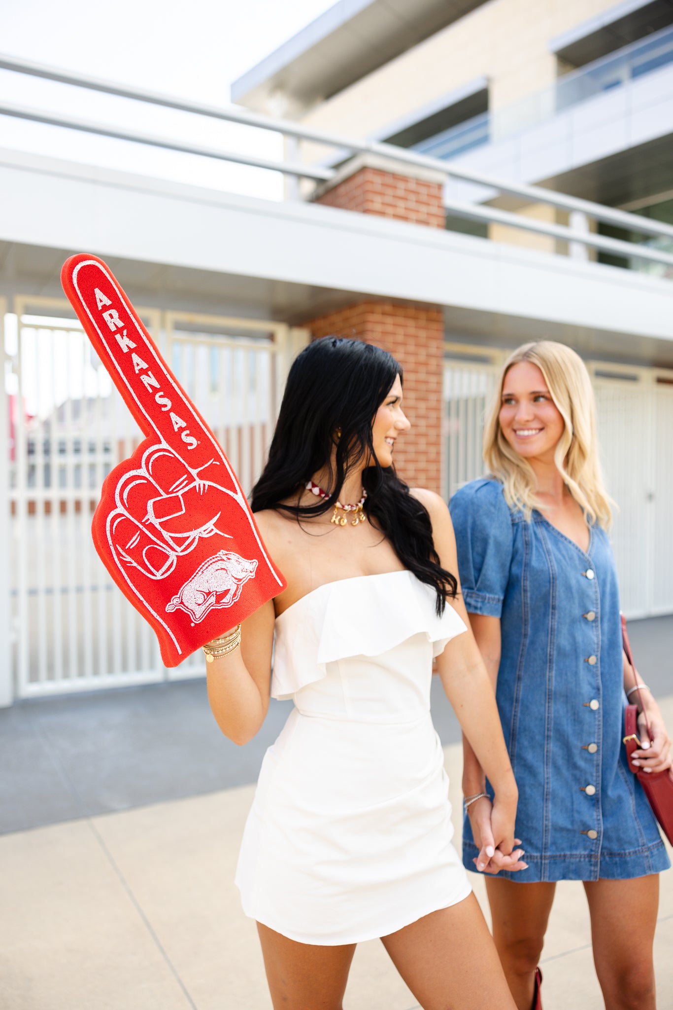 Flirty and fun—this strapless denim romper features a ruffled neckline, cinched waist, and relaxed fit for an effortless one-and-done look.