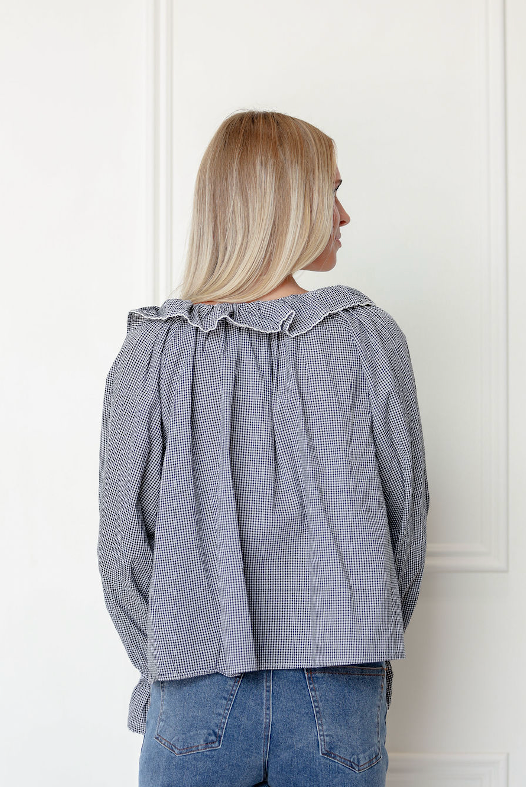 The Suzy Gingham Collared Blouse features a classic black-and-white check print, accented with a ruffled collar and button-down front. It is lightweight and has a relaxed fit, making it ideal for everyday wear.