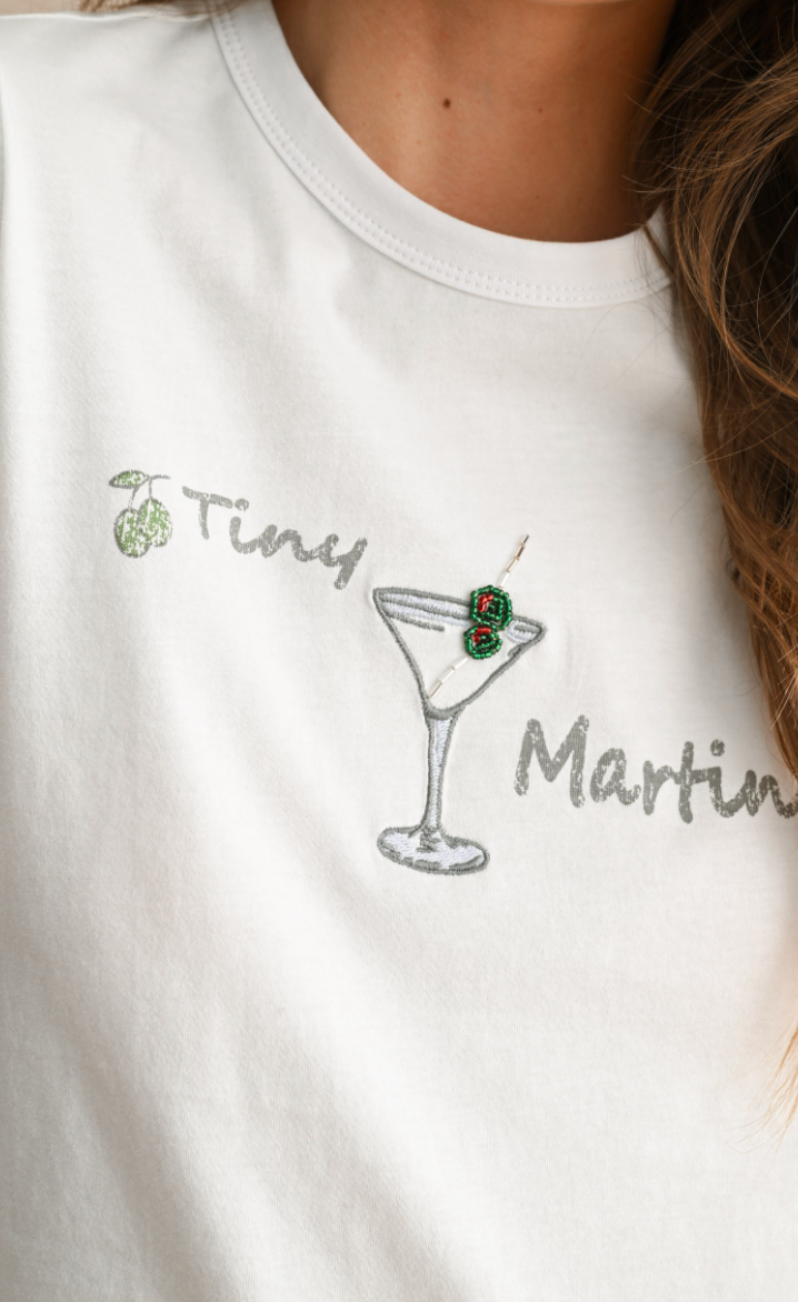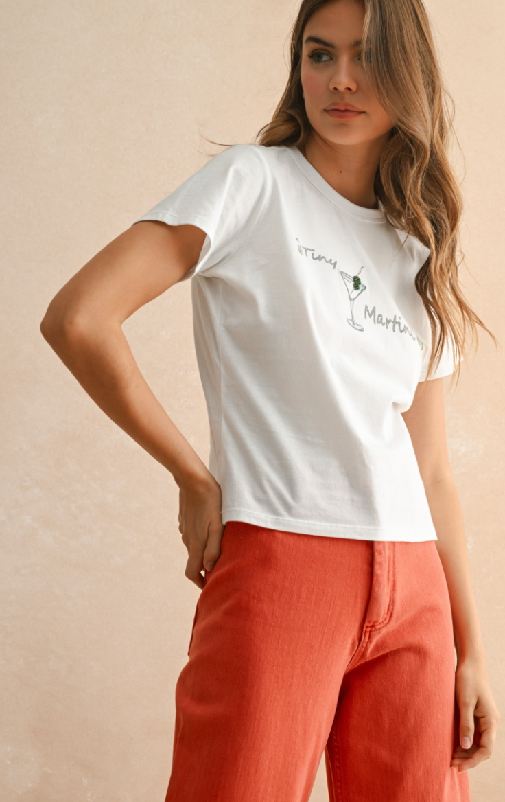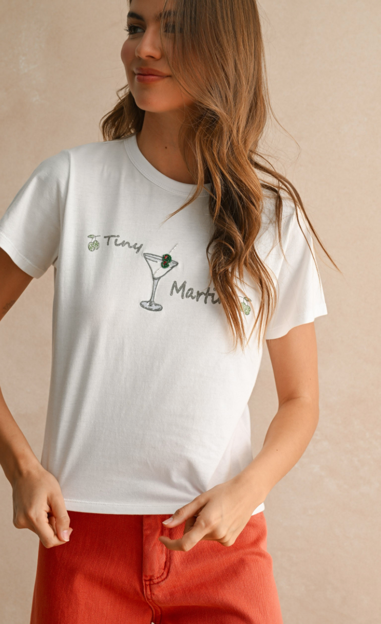 The Tini Martini Graphic Tee adds a playful twist to your everyday rotation. With its relaxed fit and cheeky embroidered martini design, this one's made for casual days with extra charm.