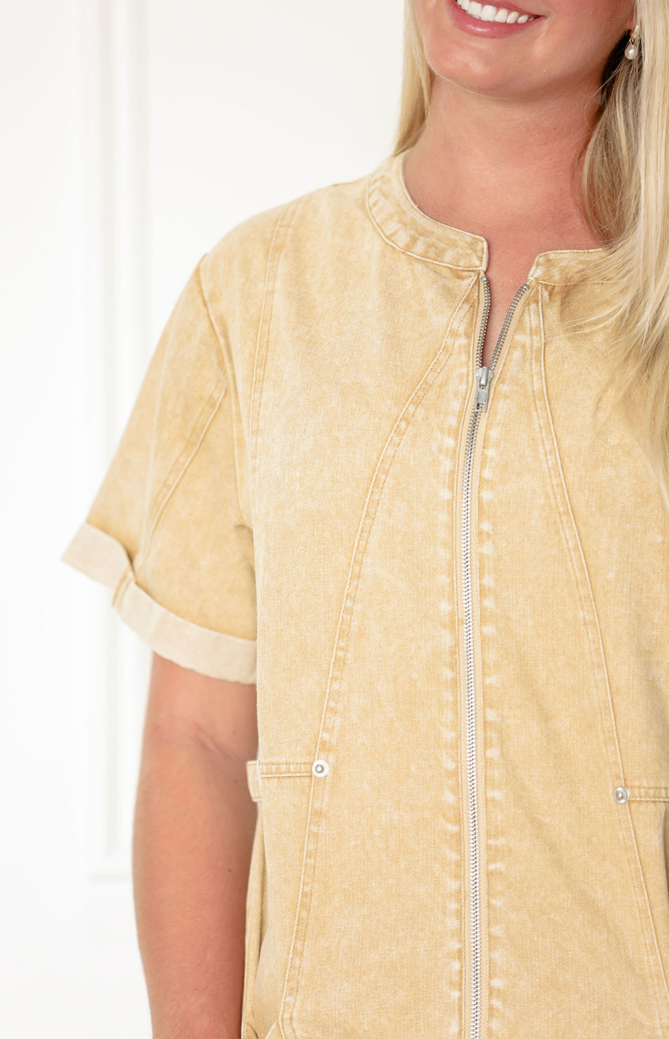 This denim romper is all about easy structure—featuring a full zip front, rolled sleeves, oversized pockets, and adjustable side tabs for a flattering fit.