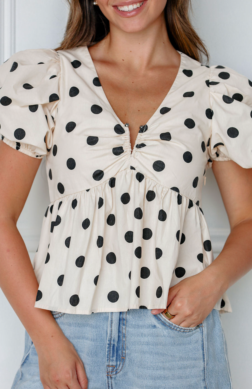 The Voluminous Polka Dot Blouse is a fun update on a classic! Featuring bold black polka dots, statement puff sleeves, and a flattering button-down design, it’s stylish, comfortable, and effortless to pair with jeans or skirts all season long.