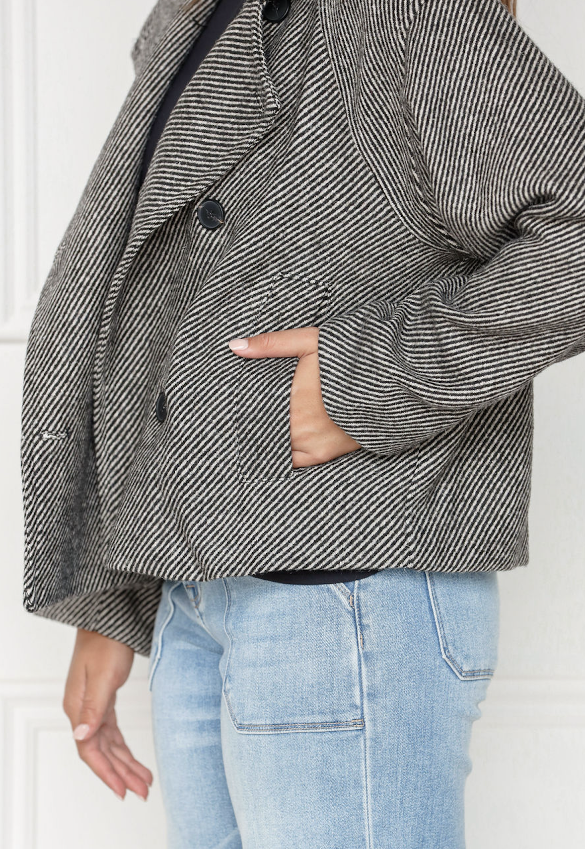 The Wilson coat features a sharp black silhouette accented with a contrasting white collar. Tailored and timeless, it’s a standout layer that adds structure and sophistication to any look.